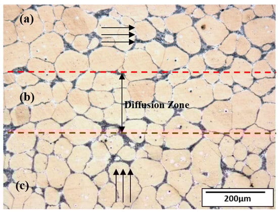 It is worth mentioning that the joining strength increases with the increase of holding time at the initial stage of the joining process due to the better coalescence of mating surfaces to ensures complete diffusion of atoms and attains a maximum strength value []. In general, in non-steady state diffusion, the concentration of diffusion species is function of both of time and position (Fick’s second law). It is thus expected with the aid of more suitable holding time, joints with highly desirable microstructure can be obtained and in turn, highly reliable bonded joints with good performance can be anticipated. Moreover, holding time has an effect on the quantity of atomic diffusion and the creep of the protrusions (i.e., elemental diffusion of the joined alloy can be improved by increasing the holding time) [].