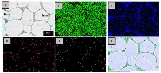 SEM-EDX elemental mapping of thixojoined part at 1300 °C of results near joint: (a) SEM micrograph, (b) Fe, (c) Cr, (d) C, (e) V, (f) all four elements.
