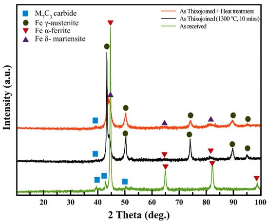 X-ray diffraction test has been carried out for more characterisation of thixojoint as displayed in Figure 11. The analysis of the diffraction patterns of as-received tool steel found peaks corresponding to the ferrite phase and iron-chromium carbide (M7C3). From the other side, the thixoweld at 1300 °C is characterised by three peaks refer to austenite and ferrite phases in addition to M7C3 carbides. The presence of austenite is primarily connected with the increasing of carbon in the solid solution that stabilizing the austenite []. Higher contents of these elements have a significant effect on the martensite temperature and consequently the transformation of austenite to martensite is very difficult. In addition, when relatively fast cooling from the solidus–liquidus range is applied there is relatively better stability for the austenitic phase at room temperature [].