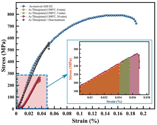 For the tensile strength, six samples were prepared using different joining parameters (the first three specimens with 1250 °C heating temperature was neglected). It is believed that the supplied heat input not providing sufficient diffusion within the joint interface even when the holding time was long. Typical stress-strain curves for the different test conditions are shown in Figure 12. With high thixowelding temperature, the produced interface is free from voids and pores due to high diffusion rates of different elements across this area. Consequently, when this high temperature accompany with long holding time, high tensile strength could be achieved. It is well known that the strength of a joint primarily depends on the quality of its microstructure. As can be observed, the tensile strength graph shows a relatively identical shape of the applied heating temperature to 1300 °C at 0, 5 and 10 min to give 241 MPa, 253 MPa and 271 MPa respectively. A minimum tensile strength of 241 MPa is recorded for the applied heating temperature of 1300 °C at 0 min. At 5 min a slight increment in tensile strength was recoded. Meanwhile, with 10 min. holding time there was remarkable improvement in tensile strength due to fact that diffusion rate is highly affected by both of temperature and time for non-steady state diffusion. The tensile value of the D2 as-supplied material (791 MPa) is more than two times if compared with the as-thixojoind value of 271 MPa. This is actually an interesting result which was achieved by a process which is simpler than conventional processes. Meanwhile, tensile strength of the joined parts after post welding heat treatment condition showed a significant improvement over the non-heat treated condition which is 560 MPa, i.e., about 70% the strength value of D2 base metal. This improvement of strength is linked to such factors as the size, distribution and dissolvement of carbides, relative proportions of austenite and martensite phases, and grain size. This explanation is also corroborated by microscopic studies which resulted in improved contrast between solid and liquid phases, whereby the big solids appeared in little liquid matrix where primary distribution of grain boundary is decreased substantially and some amounts of eutectic carbides dissolve in the matrix.