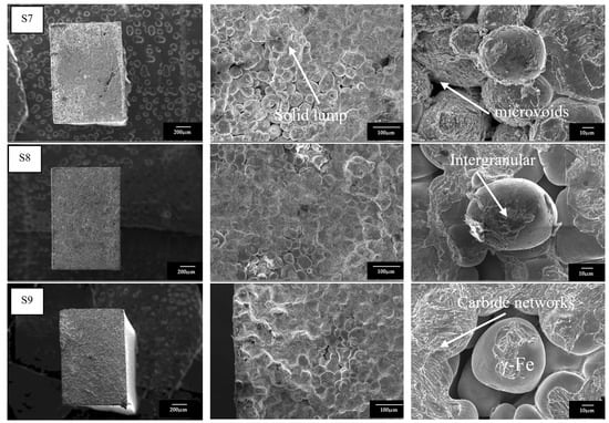 Fractured surface of welded joints of samples processed at various conditions: (S7) 1300 °C/0 min, (S8) 1300 °C/5 min, (S9) 1300 °C/10 min.