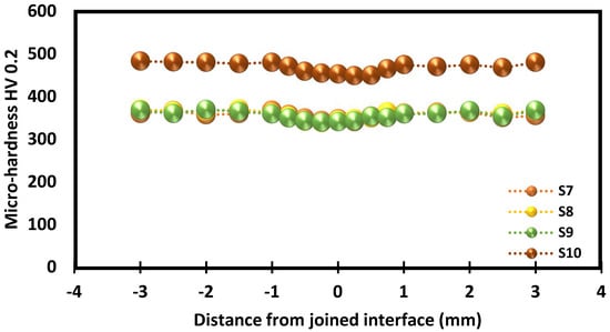 Hardness distributions of D2–D2 tool steel thixowelded joints at various conditions: (S7) 1300 °C/0 min, (S8) 1300 °C/5 min, (S9) 1300 °C/10 min, (S10) 1300 °C/10 min + post welding heat treatment.