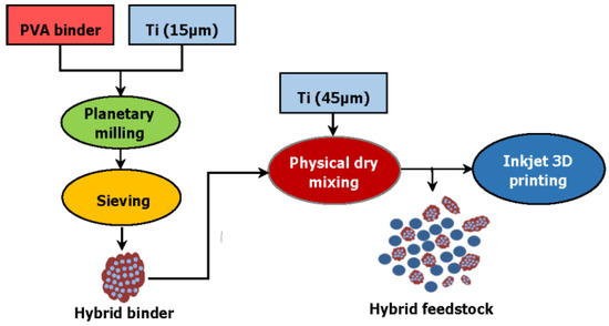 A hybrid modified binder system was synthesized by mechanical milling of an equal volumetric amount of PVA with fine Ti15 powder (as shown in Figure 1) using a planetary ball milling machine PM-400 RETSCH, Germany. The ball to powder ratio was kept at 3:1 and milled at 200 rpm for 3 h. No process control agent was utilized during powder milling. The powders were fully dried in a vacuum oven at 110 °C overnight and later sieved through a mesh with 80 µm opening size. The hybrid binder was then dry mixed with Ti45 powder to prepare the modified feedstock. The total binder content in both the original and modified feedstock was set to 7.5 wt %.