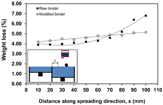 The results of thermal gravimetric analysis (TGA) conducted on the green parts fabricated by utilizing PVA and hybrid binders are shown in Figure 4. In the case of PVA, along the powder spreading distance at x = 10–100 mm, the weight loss due to burning of PVA increases (up to T = 600 °C) and found to be the maximum at x = 100 mm (~6.8%) with a binder gradient of ~2.5 wt %. These results indicate increase in the amount of binder content (PVA) along the powder spreading direction, thereby revealing segregation effects in the powder bed, which may be due to the combined effects of: (a) difference in the density values between the binder (PVA, 1.19 g/cm3) and metal powder material (Ti, 4.51 g/cm3) [9], and (b) difference in the powder morphology between the binder (PVA, irregular) and base powder (Ti, spherical) [8], as shown in Figure 2. The TGA results of the hybrid binder indicate a significant reduction in the binder gradient (~1 wt % at x = 100 mm) along the powder spreading direction indicating the possibilities for obtaining more homogenous properties on the powder bed of inkjet 3D printing.