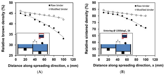 (A) Relative brown density, and (B) Relative sintered density of printed parts along the powder spreading direction utilizing PVA and hybrid binder system.