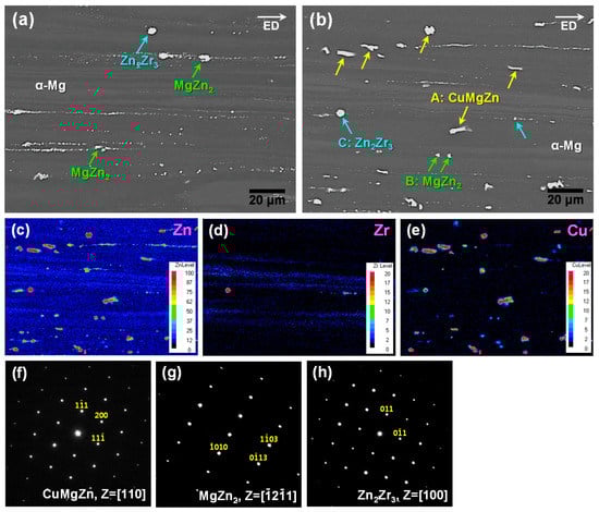 Scanning electron microscopy (SEM) micrographs of the extruded (a) ZK60 and (b) ZKC601 alloys; the energy probe microanalysis maps obtained from the ZKC601 alloy for (c) Zn, (d) Zr and (e) Cu; and electron beam diffraction patterns from (f) CuMgZn, (g) MgZn2 and (h) Zn2Zr3 in the ZKC601 alloy.