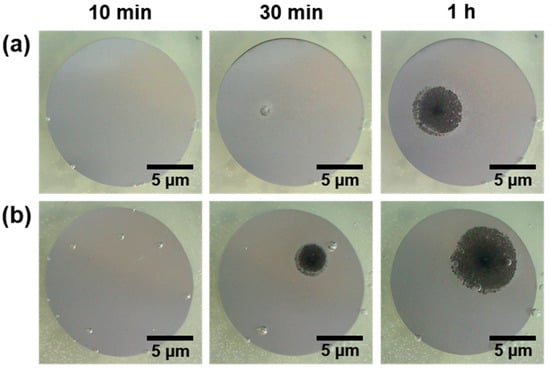 The macroscopic corrosion development of the extruded alloys during the immersion in the 0.6 M NaCl solution at 25 °C is shown in Figure 2. Overall, the extruded alloys showed similar corrosion behavior as their corrosion initiates in the typical local corrosion mode, before propagating in the filiform corrosion mode. During the early stage of immersion for 10 min, both the alloys appeared to be free of local corrosion. However, after immersion for 30 min, severe corrosion started forming on the ZKC601 alloy, while localized corrosion appeared to initiate in the ZK60 alloy, which is indicative of faster corrosion development in the former than in the latter during the immersion tests.