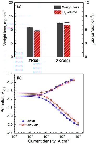 (a) Values of weight loss and collected H2 volume after immersion for 72 h in 0.6 M NaCl solution and (b) potentiodynamic polarization curves of the ZK60 and ZKC601 alloys.