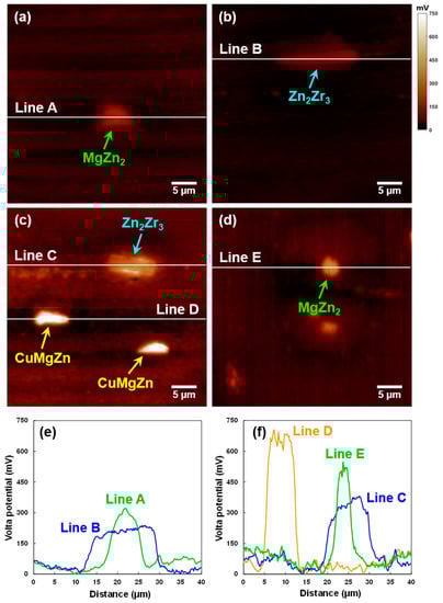 Scanning Kelvin probe force microscopy (SKPFM) images of the extruded (a,b) ZK60 and (c,d) ZKC601 alloys; and corresponding Volta potential profiles along the lines (e) A–B and lines (f) C–E in the SKPFM images.