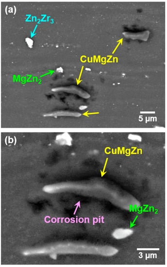 A SEM micrograph showing the corroded surface of the ZKC601 alloy after immersion for 1 h in the 0.6 M NaCl solution is provided in Figure 5 to reveal the dependence of the corrosion development on the presence of intermetallic particles. As expected, severe corrosion preferentially occurred around CuMgZn particles, whereas such localized corrosion was not observed around the less noble Zn2Zr3 and MgZn2 particles. This indicates that the presence of noble CuMgZn particles in the ZKC601 alloy can degrade its corrosion resistance by activating microgalvanic corrosion between the α-Mg matrix and the intermetallic particles.