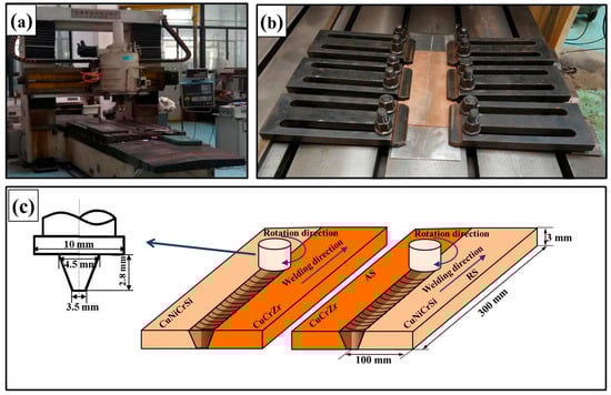 The laboratory equipment, experimental setup, schematic presentation of friction stir welding process and dimensions of FSW tool. (a) The laboratory equipment; (b) experimental setup; (c) schematic presentation of friction stir welding process and dimensions of FSW tool.