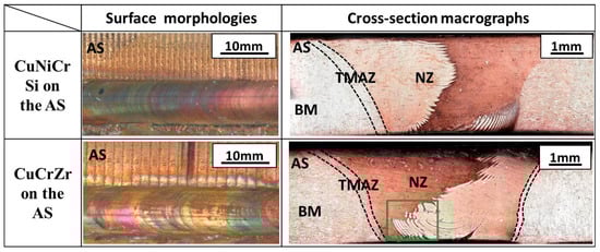 The surface morphologies and the cross-section macrographs of dissimilar CuCrZr/CuNiCrSi butt joints with the CuCrZr alloy or the CuNiCrSi alloy located on the advancing side (AS).