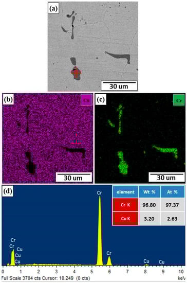 EDS images showing the analyses of elemental concentration in coarse particles distributing in CuCrZr-NZ with the CuCrZr alloy on the AS. (a) Micrograph of the surface revealing the presence of coarse particles; (b) copper; (c) chromium; (d) EDS analysis revealing the elements of coarse particles.
