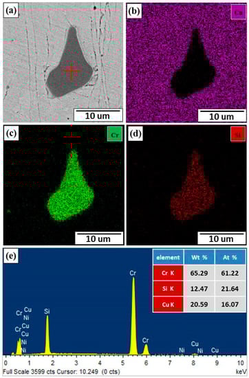 In Figure 5 and Figure 6, the coarse particles distributing in CuCrZr-NZ and CuNiCrSi-NZ with the CuCrZr alloy on the AS were analyzed. It is to be noted that the analyses are similar for welds with the inverse material location. From Figure 5 and Figure 6, it is seen that the coarse particles in CuCrZr-NZ are primarily consisted of Cr element while Cr and Si element mainly concentrate on coarse particles in CuNiCrSi-NZ. Actually, these coarse particles are solute-rich particles which are formed during the solidification of the alloy due to the limited solubility of Cr and Si elements in Cu matrix []. Obviously, these coarse particles even cannot be solved during the process of FSW. No previously related study with similar experimental results can be compared by one to one but Jha et al. [], who studied the FSW of aged CuCrZr alloy plates, reported the relevant results, and also found coarse particles in the NZ were identified as Cr concentration, However, these coarse particles are not effective on increasing strength any more []. In contrast, these coarse particles may act as internal stress concentrators which make the alloy easier to fracture [].
