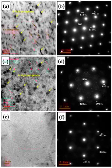 Figure 8 reveals the bright field TEM micrographs with relevant SAD patterns of samples from CuNiCrSi-BM and CuNiCrSi-NZ with the CuCrZr alloy on the AS. Figure 8a shows that the lobe-lobe contrast Cr precipitates can also be defected in CuNiCrSi-BM. However, the reflection spots of Cr precipitates cannot be found from the relevant SDA pattern (Figure 8b) parallel to [011]Cu. Another type of precipitates which are rod-shaped in [011]Cu direction (Figure 8a) and disc-shaped in [111]Cu direction (Figure 8c) can also be found in CuNiCrSi-BM. Moreover, the corresponding SAD patterns parallel to [011]Cu direction (Figure 8b) and [111]Cu direction (Figure 8d) reveal the precipitates have a δ-Ni2Si crystal structure []. However, it is similar to samples from CuCrZr-NZ, no precipitates are detected in samples from CuNiCrSi-NZ based on bright field TEM micrographs (Figure 8e) and relevant SAD pattern (Figure 8f).
