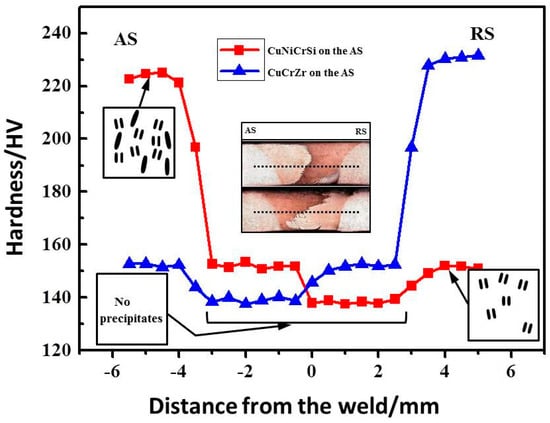 In Figure 10 and Figure 11, both the micro-hardness and the tensile strength of joints are lower than those of two base metals. It is well-known that both the hardness distribution and tensile strength is directly dependent on the distribution of precipitates. The precipitates in CuNiCrSi-NZ and CuCrZr-NZ, which can pin the movement of dislocation and thus improve the strength of alloy, were both dissolved into Cu matrix. In this case, the dissolution of precipitates can lead to the decrease of both the micro-hardness and the tensile strength.