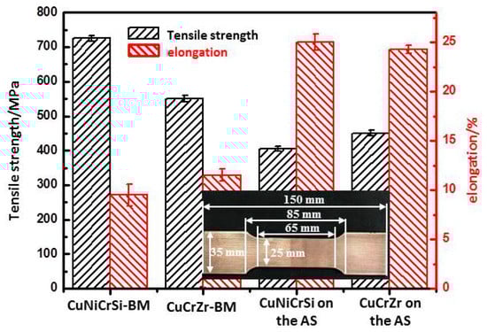 Copper alloys are widely used in industries for its high electrical conductivities. However, the strength of conventional copper alloys is usually limited in contrast with its high electrical conductivity []. CuCrZr and CuNiCrSi are excellent and unique copper alloys, which possess a desirable combination of high strength and good electrical conductivities after solution treatment and aging process. The ultimate tensile strength (UTS) and electrical conductivity of CuCrZr alloy can reach to more than 530 MPa and 80% IACS []. In comparison, the CuNiCrSi alloy shows a higher ultimate tensile strength of 600–800 MPa but a lower electrical conductivity of about 45% IACS due to different additions []. The dissimilar joints of CuCrZr and CuNiCrSi alloy with good balance of strength and electrical conductivity can be widely applied to many industries, such as large generator rotor and international thermo nuclear experiment reactor (ITER) components [,].
