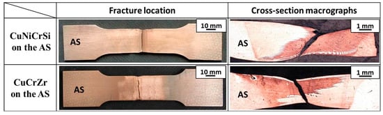 The failure locations and cross-section macrographs of tensile testing specimens with the the CuCrZr alloy or the CuNiCrSi alloy located on the AS.