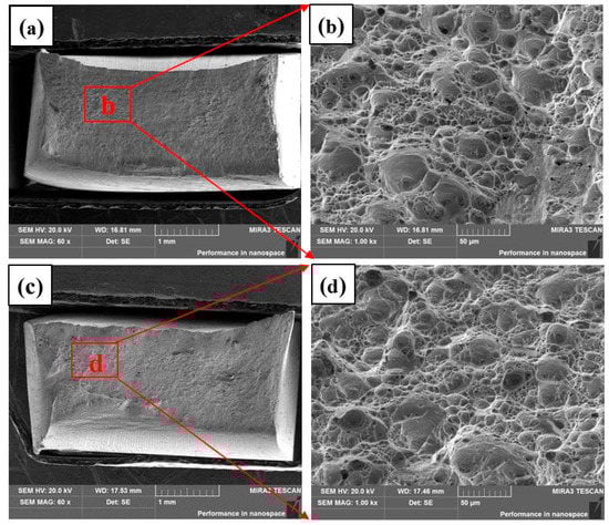 Figure 13 shows the SEM micrographs of fracture surface of the dissimilar joints with the the CuCrZr alloy or the CuNiCrSi alloy located on the AS. Figure 13a shows the fracture surface of welds with the CuCrZr alloy on the AS while Figure 13c shows that with the inverse material position. Figure 13b,d show the magnified views of selected zones in Figure 13a,c, respectively. It can be found that the fracture surfaces both consist of fine populated dimples, which confirms that the dissimilar joints fail in the ductile mode of failure. No significant difference in the fracture mechanism with different material positions. Both selected samples experience extensive plastic deformation during the process of failure in these two conditions.