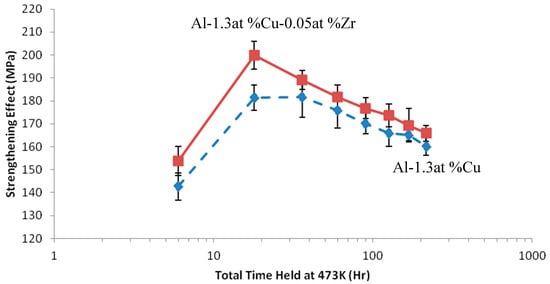 Figure 3 describe the strengthening behavior observed for the isothermal and stepped aging experiments, respectively. From these results, it could immediately be seen that all Zr-bearing Al-Cu alloys invariably maintained a higher strength than the binary Al-Cu alloys, by what appears to be a constant strengthening increment for each set of experimental parameters. This strengthening increment appears to be thermally stable at elevated temperatures that would normally coarsen and overage Al-Cu (primarily Al