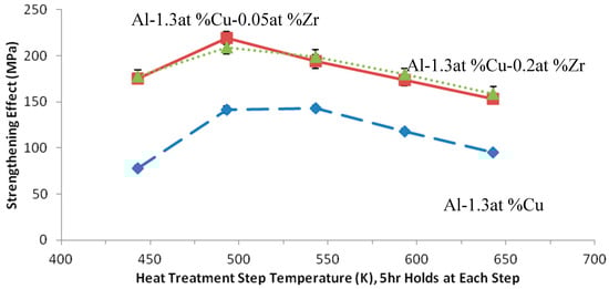 Without consulting TEM images of the sample microstructure, the false assumption could be reached that the Zr additions do not significantly affect the Al-Cu precipitation behavior, and that the observed thermally stable strengthening increment is entirely because of strengthening contributions of Al