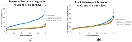 Figure 5. This comparison indicates that the Al-Cu precipitate aspect ratio distributions are consistent between Al-Cu and Al-Cu-Zr alloys. It also shows that the average Al-Cu precipitate length, while similar in both observed Al-Cu-Zr alloys, is noticeably larger in the binary Al-Cu alloy.