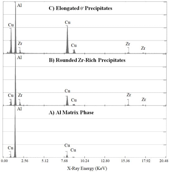 Figure 6. When analyzed with EDS, these rounded precipitates contain not only Al and Zr, as would be expected with simple Al