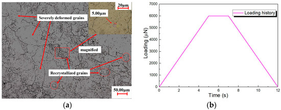 Locations and parameters of nanoindentation tests: (a) examples of indentation locations including the interiors of deformed grains and recrystallized grains; (b) loading history of nanoindentation tests.