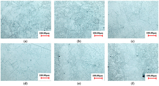 Microstructure of sample B at the interruption strain of 0.511 and different holding times: (a) 0 s; (b) 3 s; (c) 5 s; (d) 8 s; (e) 20 s; (f) 50 s.