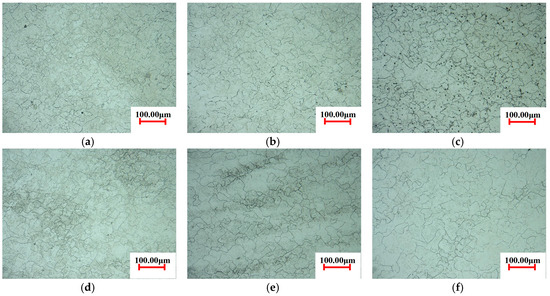 Microstructure of sample A at the interruption strain of 0.151 and different holding times: (a) 0 s; (b) 5 s; (c) 50 s; (d) 120 s; (e) 200 s; (f) 600 s.