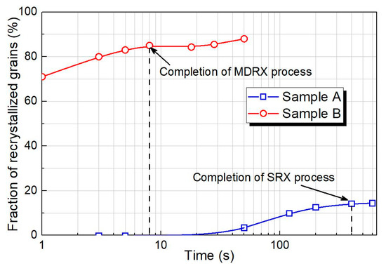 - The SRX occurred alone in samples without initial DRX grains, after an incubation time around 50 s. In contrast, MDRX grain initially appeared within 1 s and completed at about 8 s in samples with a high initial volume fraction of DRX grains.