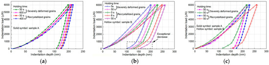 Figure 7 depicts the indentation load versus indentation depth (P–h) curves of samples A and B at conditions of different holding times (isothermal annealing times after deformation). To avoid overlap, some representative curves of indentations located at the deformed grains and recrystallized grains were analyzed. According to Equations (3)–(5), the indentation hardness was inversely proportional to the contact height , which could be obtained visually. As shown in Figure 7a, increased with the holding time, not only in the static recrystallized grains but also in the deformed grains. It indicated that the SRX process plays an important role in the appearance of softening behaviors in both the deformed grains and SRX grains. With regard to sample B (see Figure 7b), in the regions of recrystallized grains as well as deformed grains decreased rapidly with the holding time increases, implying a negative dependence of indentation hardness of each component in the same sample on the volume fraction of MDRX grains. The exceptional increase of indenter velocities at the end of unloading curves could be attributed to the effect of pile-up [34,35] and SSDs, which will be discussed subsequently. Figure 7c illustrates the P–h curves obtained from different regions in samples A and B at the same holding time of 50 s. As a result of the significant strain-hardening effect [19], the average value of at the region of deformed grain in sample B was greater than that of the deformed grain in sample A. However, of the MDRX grain was smaller than that of the SRX grain, which indicates that the MDRX process led to a more significant softening effect within the microstructural evolution regime of 300M steel.