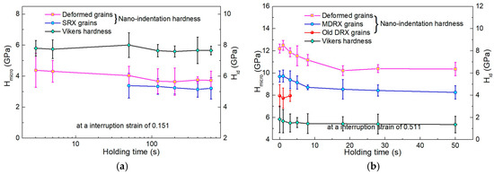 Figure 8 presents the variation of average Vickers hardness and indentation hardness corresponding to samples A and B at different holding times. As shown in Figure 8a, the sudden reduction of of deformed grains in sample A was attributed to the appearance of SRX grains, which need a long incubation time, around 50 s, for the transformation of the subgrains in the vicinity of grain boundaries into nuclei [11]. We assumed that a portion of DRX grains with a relatively low dislocation density would not induce MDRX process at an early annealing time. As a result of the difference of dislocation densities, the old “stubborn” DRX grains and MDRX grains could be distinguished by the value of indentation hardness (which is related to the average dislocation density [22]). Observations from Figure 8b indicated that the value of deformed grains in sample B as always higher than that of both MDRX grains and old DRX grains, regardless of the holding time. The differences were ascribed to the inhomogeneous dislocation distribution during PDRX. In fact, of deformed grains apparently reduced by as much as 24% at the completion time of the MDRX process, implying that the MDRX process consumed the stored dislocations gathered in the deformed grains to develop a more stable microstructure (see Figure 4d). In addition, of MDRX grains were initially much higher than that of the old DRX grains; they subsequently decreased by approximately 17% before 8 s (which was the completion time of MDRX process) and finally converged to 4 GPa, which was the average indentation hardness of old DRX grains. The results validated the proposed hypothesis that the MDRX process induced by the DRX grains was thermally activated and the DRX grains with relative high dislocation density recrystallized preferentially. As an important, integrated softening feature, the average Vickers hardness of sample A remained largely constant before occurring SRX grains and decreased gradually with the increase of SRX volume fraction. Combined with Figure 5, a similar softening pattern can be summarized in the average Vickers hardness of sample B. The results from nanoindentation hardness and Vickers microhardness tests indicate that the softening fraction caused by MDRX and SRX process can be qualitatively described through the reduction of micro- and nano-hardness of both recrystallized grains and adjacent deformed grains, and the dependencies of the integrated softening effects on volume fractions of MDRX and SRX were clearly observed.