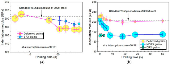 Additional conclusions as to the dependence of Young’s modulus on the volume fractions of MDRX and SRX can be seen in the modulus results (which were computed from Equations (2)–(4) of the nanoindentation tests) corresponding to different grains, as shown in Figure 9. In Figure 9, the volume fractions are represented by the areas of the spheres. The standard Young’s modulus of 300M steel at room temperature is 205 GPa (see the dotted line in Figure 9). As shown in Figure 9a, at an interruption strain of 0.151, the values of deformed grains remained nearly the same as the standard Young’s modulus of 300M steel before the holding time of 50 s; they subsequently decreased as the volume fraction of the SRX grains increased. In contrast to the deformed grains, values of SRX grains remained largely stable at about 197 GPa, regardless of the volume fractions. The former reduction was attributed to an increase in the level of crack damage within sample A during SRX process, which resulted from a formation of the nonequilibrium grain boundaries [19]. In contrast to the standard modulus, Young’s modulus of deformed grains and SRX grains were underestimated because of the sink-in phenomena [34]. At an interruption strain of 0.511, the MDRX process was the dominate microstructural evolution regime, as discussed above. The values of deformed grains were initially much higher than 205 GPa, as a consequence of lattice distortions reducing stiffness under large deformation conditions [23]. However, with the increase of volume fraction of the MDRX grains, the values of deformed grains as well as the MDRX grains decreased sharply before the holding time of 8 s. The values of deformed grains finally converged to 205 GPa, indicating that MDRX may have consumed the stored dislocations in the deformed grains and recovered the inner distortions associated with dislocations. Notably, as seen in Figure 9b, the values of MDRX grains decreased rapidly and then converged to a constant value, which as the same as the values of the old DRX grains. The interesting transformation phenomenon can be interpreted by the fact that some of the DRX grains with high dislocation density gradually recrystallized to consume the stored dislocation inside, while adjacent deformed grains formed more stable DRX grains with low dislocation density, which was similar to the old “stubborn” DRX grains. In summary, the softening characterization of the MDRX and SRX process could also be indicated by reductions of Young’s modulus at both the deformed and recrystallized grains.