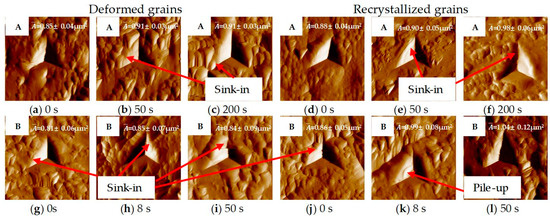 The SPM images of indentation morphology on the deformed grains and recrystallized grains corresponding to: (a–f) sample A at the holding time of 0 s to 600 s; (g–l) sample B at the holding time of 0 s to 50 s. Data points correspond to average values from 16 measurements for each indentation, and absolute errors correspond to one standard deviation about the mean values.