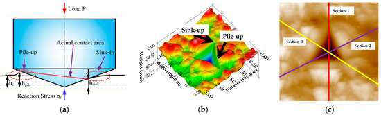 (a) Pile-up and sink-in behaviors during nanoindentation tests; (b) a 3D probe scanning of a 3 μm × 3 μm patch of the indentation surface corresponding to Figure 10k; (c) the three characteristic cross sections across the center point.