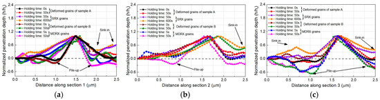 Figure 12 illustrates the variation of normalized penetration depths () with the distance along the three characteristic cross sections. As shown in Figure 12a, the sink-in phenomena are clearly observed on the surface of the SRX grains. This was predominantly attributed to the softening effect of the SRX regime. With regard to Section 2 and Section 3, the sink-in phenomena on the surface of SRX grains were significantly enhanced in relation to increases in holding time, implying a strong dependency of sink-in phenomena on the volume fraction of SRX grains. In contrast to sample A, both Figure 12a,c demonstrate that pile-up was prominent during indentation tests at both of the MDRX grains and deformed grains within sample B; additionally, the extent of pile-up phenomena gradually increased with additional holding time. This suggested that the MDRX process resulted in notable pile-up features during indentation tests. Therefore, the softening effects of MDRX and SRX on the overall mechanical properties of the 300M steel were reflected in the exceptional indentation morphology, including the sink-in and pile-up phenomena. Notably, the softening indentation morphology accounted for the exceptional decrease in P–h curves and underestimation of Young’s modulus. When the material of sample A sank in, the contact area was overestimated, leading to an underestimation of Young’s modulus during the SRX process (see Figure 9a). Once the material piled up, the contact area will be underestimated, resulting in the underestimation of reaction force .