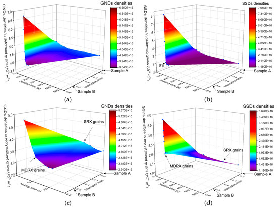 where is a constant related to the material (~0.4 for 4340 high-strength steel, similar to 300M steel [39]), and is the shear modulus (80 GPa for 300M steel). The variations of average SSDs and GNDs densities of different grains in sample A and B with the holding time are depicted in Figure 13. From the observation of Figure 13a, the initial value of average GNDs density corresponding to the deformed grain in sample A was 4.33 × 1015 m−2, which was significantly less than those of the deformed grain in sample B (6.64 × 1015 m−2). The difference may be attributable to the large plastic strain, which led to a greater gradient of plastic deformation on the surface of samples [19]. The average GNDs densities of deformed grains in sample A and B decreased with an increase in holding time. As shown in Figure 13b, the SSDs densities of deformed grains decreased more rapidly than the average GNDs densities during MDRX; they remained unchanged after 8 s, which was approximately the completion time of the MDRX process. The results from Figure 13a and b indicate that the softening behaviors of deformed grains during the MDRX process (see Figure 8 and Figure 9) can be mainly attributed to the reduction of average SSDs densities, while the SRX process resulted in an additional softening effect on mechanical properties of deformed grains through the consumption of both of the stored GNDs and SSDs densities. In Figure 13c, the average GNDs densities of SRX grains and MDRX grains decreased gradually in relation to holding time, until the completion of PDRX process. In addition to the deformed grains with higher dislocation density, the SRX grains and MDRX grains with relatively low GNDs densities were also softened during post-deformation annealing. As stated above, the GNDs are related to the gradient of plastic deformation, the MDRX and SRX process contributed significantly to weakening the residual effects of non-uniform plastic deformation. In contrast, in Figure 13d, the average SSDs densities of SRX grains remained nearly the same, while those of MDRX grains decreased gradually in relation to the increases in volume fraction of MDRX grain. In sample B, the reduction of average SSDs and GNDs densities in MDRX grains were significantly less than those of deformed grains. In summary, the MDRX softening process proceeded by consuming the average SSD densities stored inside of the deformed grains, while the SRX process contributed to the softening behaviors of different grains by decreasing the GNDs of SRX grains and SSDs of deformed grains. The average SSDs density decreased markedly during the MDRX process than that during SRX, which indicated that the MDRX process led to a more significant softening effect within the microstructural evolution regime of 300M steel.