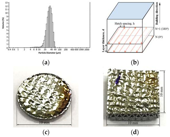 (a) Particle distribution of the NiTi powder; (b) Illustration of scan strategy of the selective laser melting (SLM) process; (c) Thin-wall disk of thickness 0.48 mm; and, (d) the cuboid sample of thickness 5 mm.