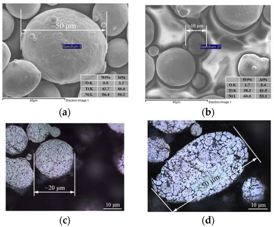 Scanning electron microscope (SEM) micrograph of NiTi powder of particle sizes (a) >45 μm and (b) <25 μm. Optical microscope (OM) image of the NiTi powder of particle sizes (c) >45 μm and (d) <25 μm.