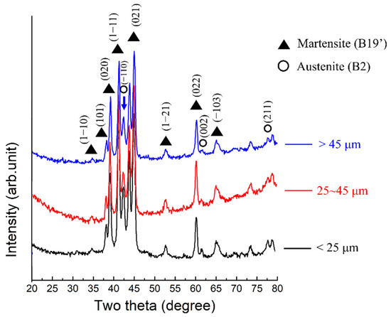 X-ray diffractometry (XRD) spectra of NiTi powder with particle sizes of <25 μm, 25–45 μm, and >45 μm.
