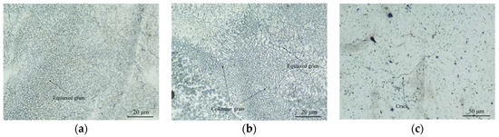 The thin-walled sample had a thickness of 0.48 mm (Figure 1b), which was approximately equivalent to 10 vertically stacked NiTi particles. Figure 5a illustrates the front of the thin-walled sample, which mainly consisted of equiaxed grains. Further, both columnar and equiaxed grains constitute the back of this sample, as illustrated in Figure 5b. In addition, many cracks and pores were observed (Figure 5c). The defect formation resulted from the rapid cooling at the back of the sample, owing to its direct contact with the substrate. Under rapid cooling, the molten pool was maintained in its molten state for a very short period, which prevented the complete elimination of pores between the NiTi particles. Moreover, columnar grains resulted from directional solidification at the face of the sample in contact with the substrate. Furthermore, the rapid cooling caused the back of the sample to exhibit a similar composition (Ni/Ti ratio and phase) as the NiTi powder (Table 2).