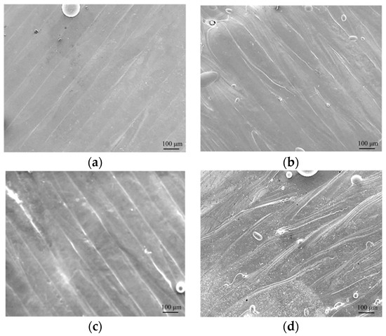 Previous studies suggested that the roughness of the sample that was achieved by laser processing depended on two fluid flow patterns in the melt pool, damped capillary oscillations, and thermocapillary flows, which occurred at relatively low and high laser-energies, respectively [22,23]. From Figure 8, in the power density range 40.7–42.7 J/mm3, the surface roughness decreased with an increasing energy density, and this region is regarded as dominated by capillary oscillation. In this region, an increased melting duration resulted in surface capillary waves being more significantly damped [22,23]. However, as the energy increased beyond 42.7 J/mm3, the roughness increased with increasing energy density because thermocapillary flows dominated the melt pool [24,25,26]. The increased roughness was due to ripples induced by the thermocapillary flows when the energy density was increased.
