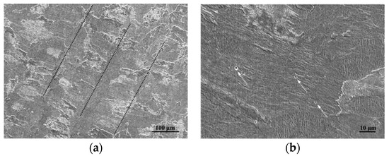 Figure 6 illustrates the SEM micrograph of a top surface of the cuboid sample perpendicular to the building direction. The laser passage strips were evident on the sample that was fabricated using a high energy density (Figure 6a). Increasing the scanning velocity was beneficial for rendering the strips invisible. The section of the cuboid sample perpendicular to the building direction was also observed. In Figure 7a, the dotted line indicated the laser passage direction, and it refers to the alternating laser route with a spacing of 130 μm. In addition, few defects in the form of small pores of a size less than 1 μm are apparent in Figure 7b.
