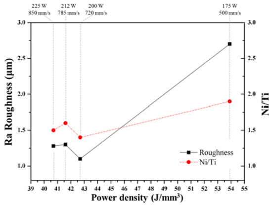 Surface roughness and Ni/Ti ratio of the SLM sample as a function of power density.