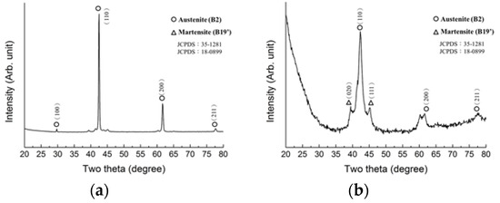 XRD spectrum of (a) SLM-NiTi sample fabricated with a power density of 42.7 J/mm3, and (b) SLM-NiTi sample after annealing at 850 °C for 1 h.