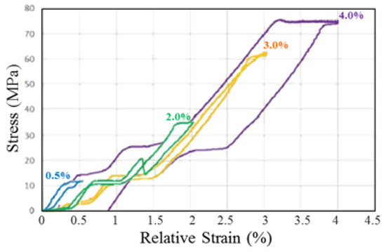 Loading–unloading curves of SLM-NiTi tensile test specimen that was fabricated with a power density of 42.7 J/mm3.