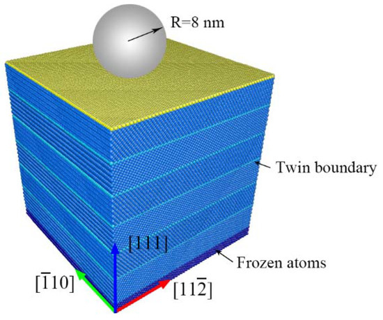 In this work, the MD simulations were performed using LAMMPS [32] with an embedded-atom method (EAM) potential for Cu [33]. The rectangular nt-Cu samples were created containing orthogonally oriented CTBs with the initial size of 23.5 × 23.5 × 24.0 nm3 and consisted of 1,121,480 atoms, as shown in Figure 1. A free boundary condition was applied along [111] orientation, which is just the indenting direction, while periodic boundary conditions were imposed along [10] and [11] orientation. The twin lamella length (denoted as λ) was chosen to be 1.25 nm, 3.67 nm, and 5.64 nm.