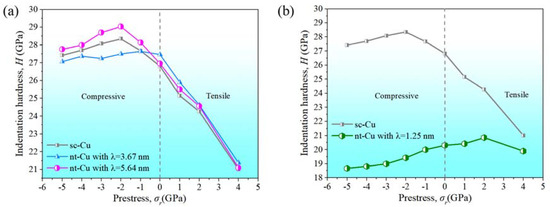 All the nt-Cu and sc-Cu have a similar change of indentation hardness with the decreasing of prestress, i.e., indentation hardness firstly increases, reaches its maximum and then decreases, as illustrated in Figure 2. The critical prestress for the maximum indentation hardness of nt-Cu is strongly dependent on the twin spacing, which decreases from 2 GPa to −2 GPa with the increase of twin spacing. This scenario is different from the experiment and finite element simulation results where the hardness monotonously decreases by increasing the prestress or residual stress [24].