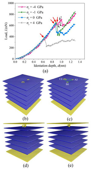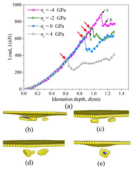 Load-displacement curves (a) and corresponding atomistic snapshots of the sc-Cu with (b) σr = −4 GPa; (c) σr = −2 GPa; (d) σr = 0 GPa; (e) σr = 4 GPa. The red arrows denote the event of initial load relaxation. The atoms are colored according to CNA, where atoms with perfect fcc lattices are hidden for clarity.